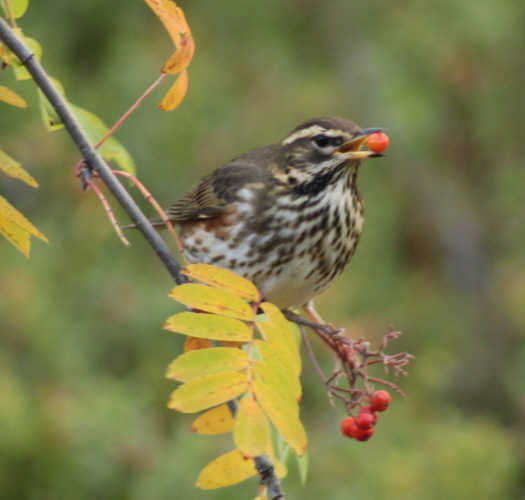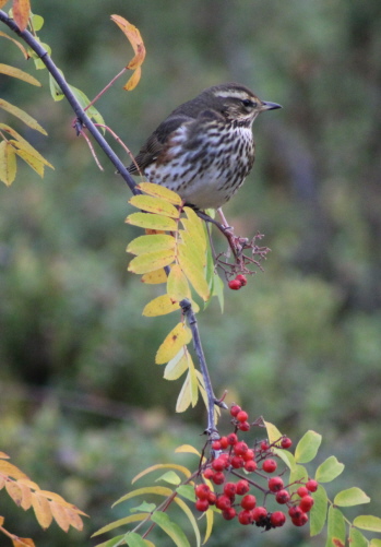 Eine Rotdrossel klaut die letzten Beeren von der Eberesche